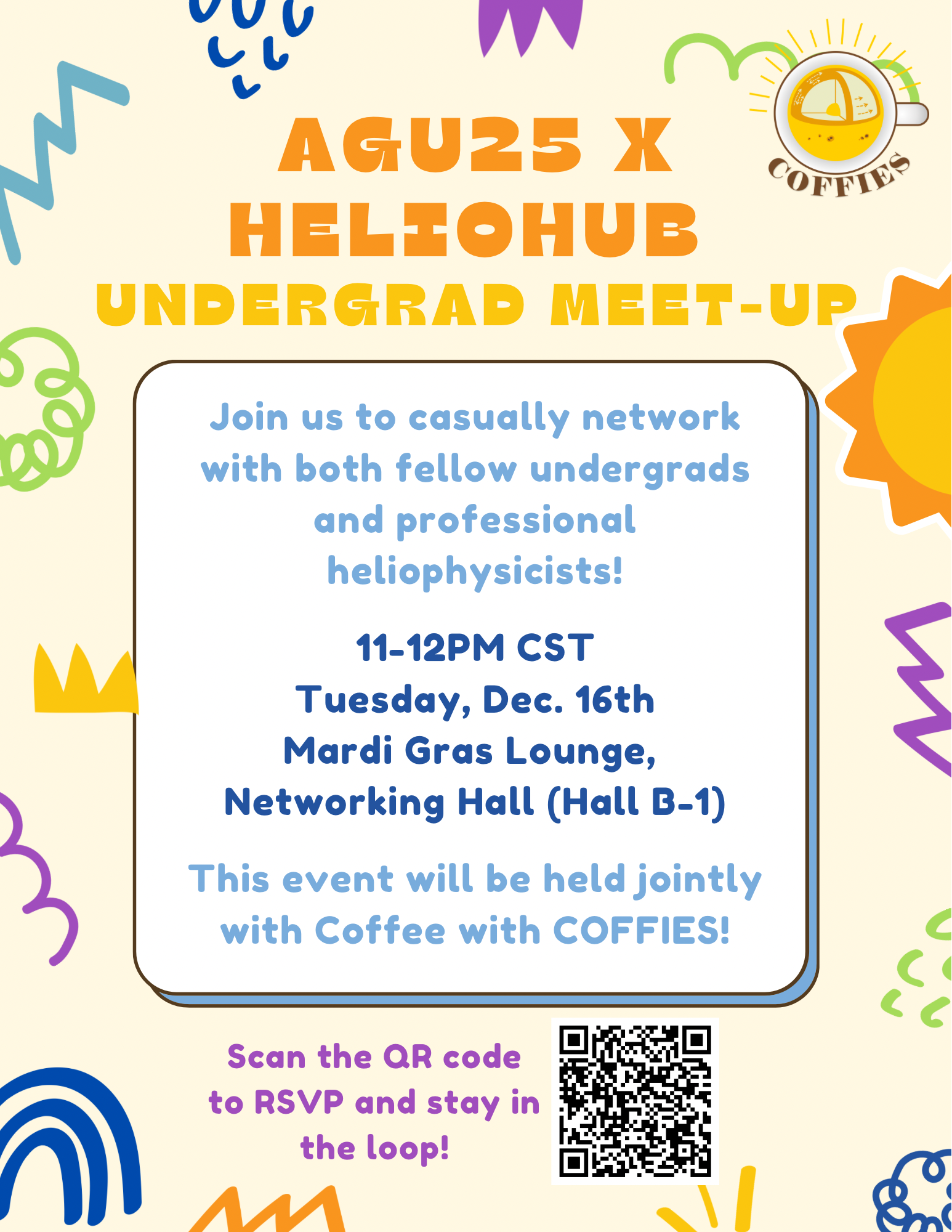 📌 This is aimed at undergrad students attending AGU who have previously participated in and/or are interested in Heliophysics and other space science research opportunities. We encourage COFFIES members to attend and engage with these undergrads, especially grad students and other early careers scientists (aka COFFIES Beans)! See the attached flier for details and to sign up on the interest form.